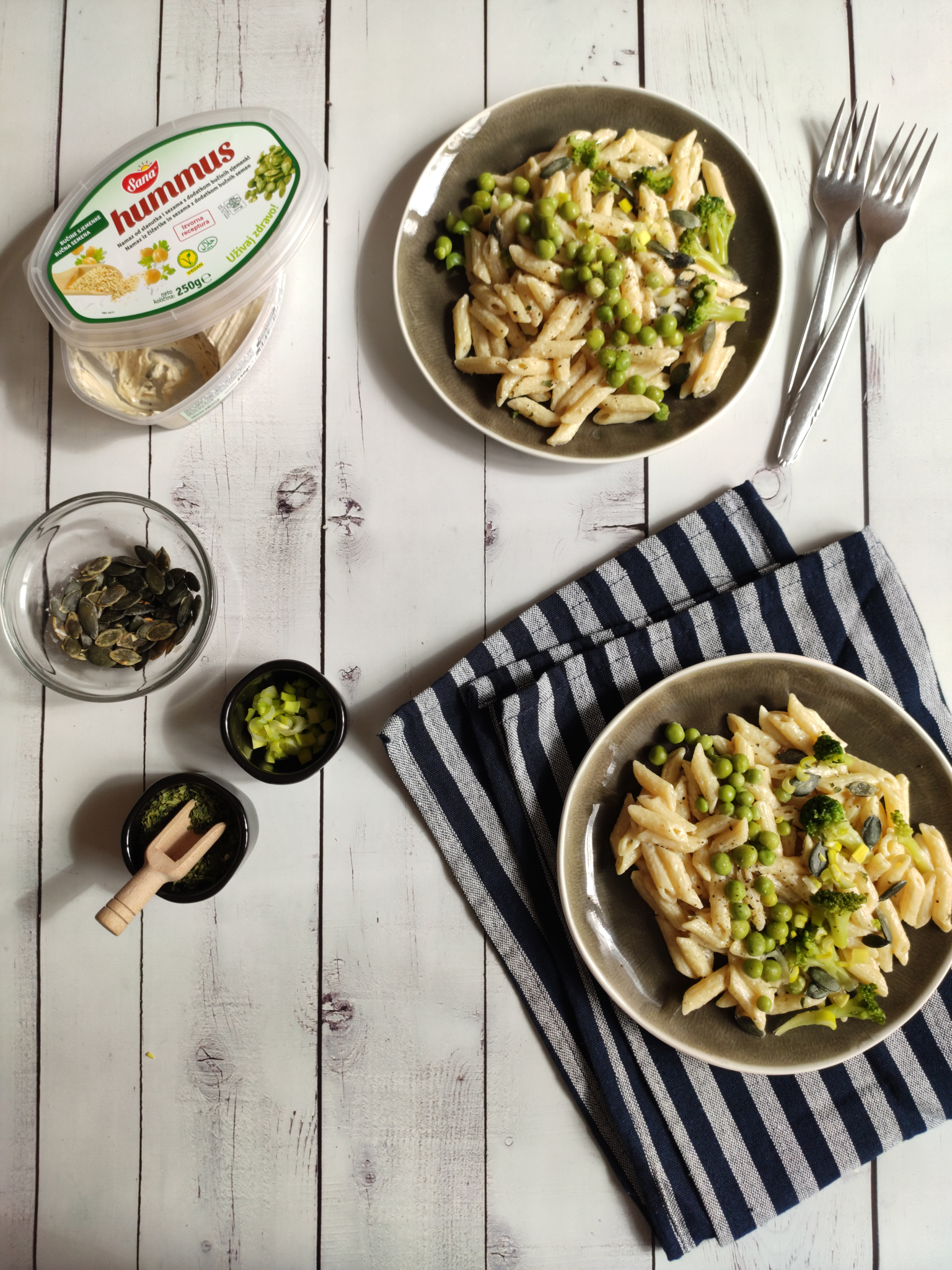 - Sjedinjavanje: Procijeđenu tjesteninu i povrće vratite u topli lonac. Dodajte Sana hummus, maslinovo ulje i začine.