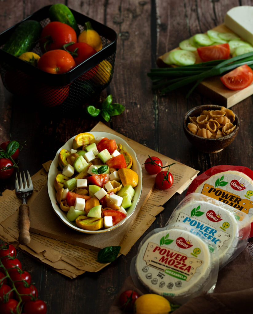 Povrće narežite na kockice, a tikvice kratko ispecite na grillu. Tjesteninu skuhajte prema uputi na pakiraju. Sve povežite s maslinovim uljem, začinite s paprom i soli. Na kraju dodajte izmrvljeni Power Greek.